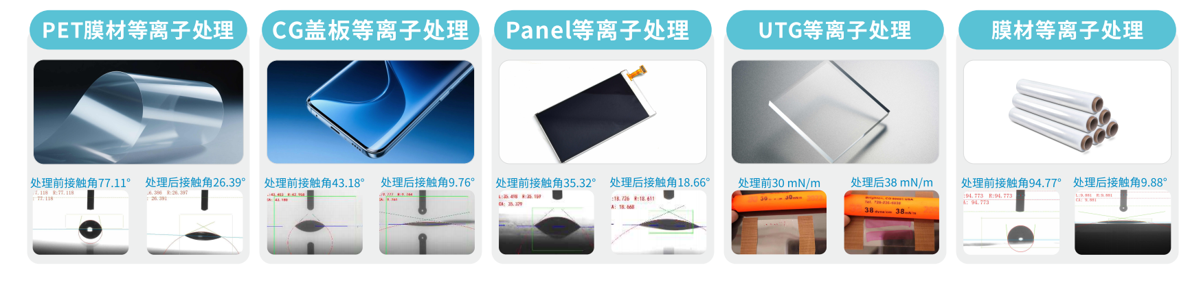 等離子可用于PET膜材、Panel、UTG、CG蓋板等材料表面預處理,提高材料表面潤濕性,改善界面結合力,從而提升后續貼合、