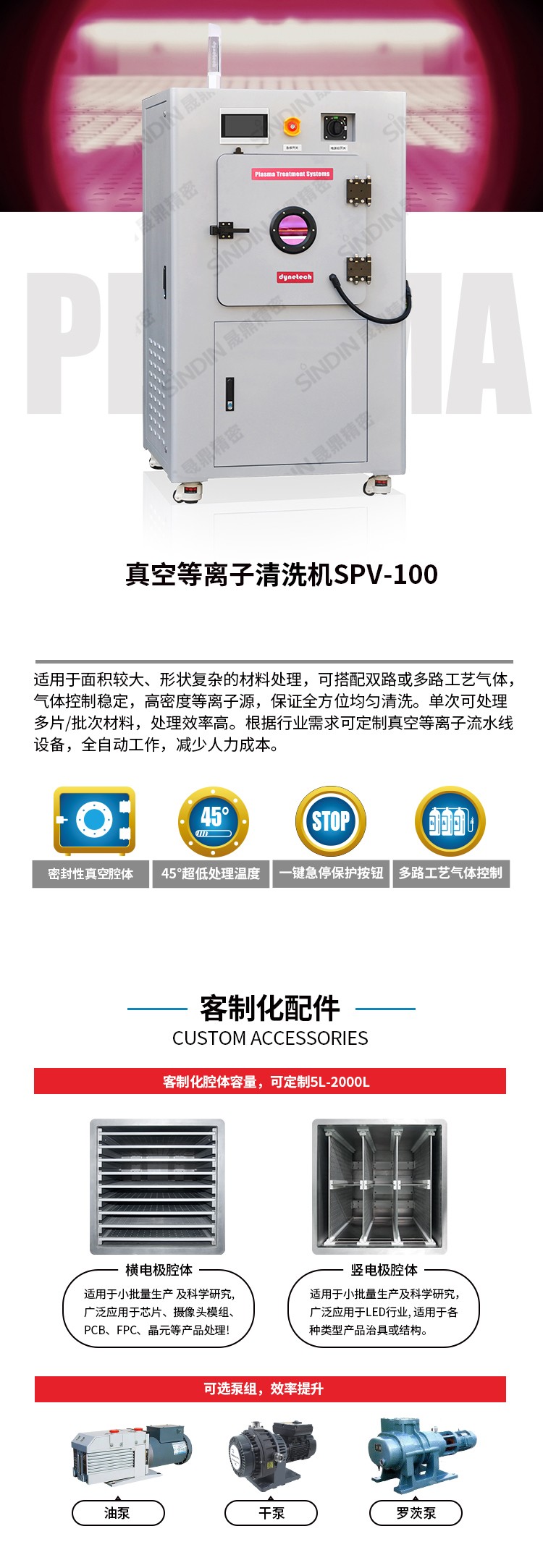 SPV-100 真空等離子清洗機(Plasma cleaner),氣體通過激勵電源離化成等離子態,等離子體作用于產品表面,清洗產品表面污染物,提高表面活性,增強附著性能。等離子清洗是一種新型的、環保、高效、穩定的表面處理方式。